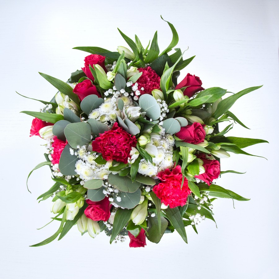 Our charming artistic floral arrangement is designed to captivate your senses and inspire creativity. A blend of soft white chrysanthemums and gypsophila, paired with striking red roses, gentle carnations, pristine white alstroemeria, and lush aspidistra leaves, creates an ensemble that is both graceful and modern. The arrangement exudes a naturally artistic flair that enhances any setting.